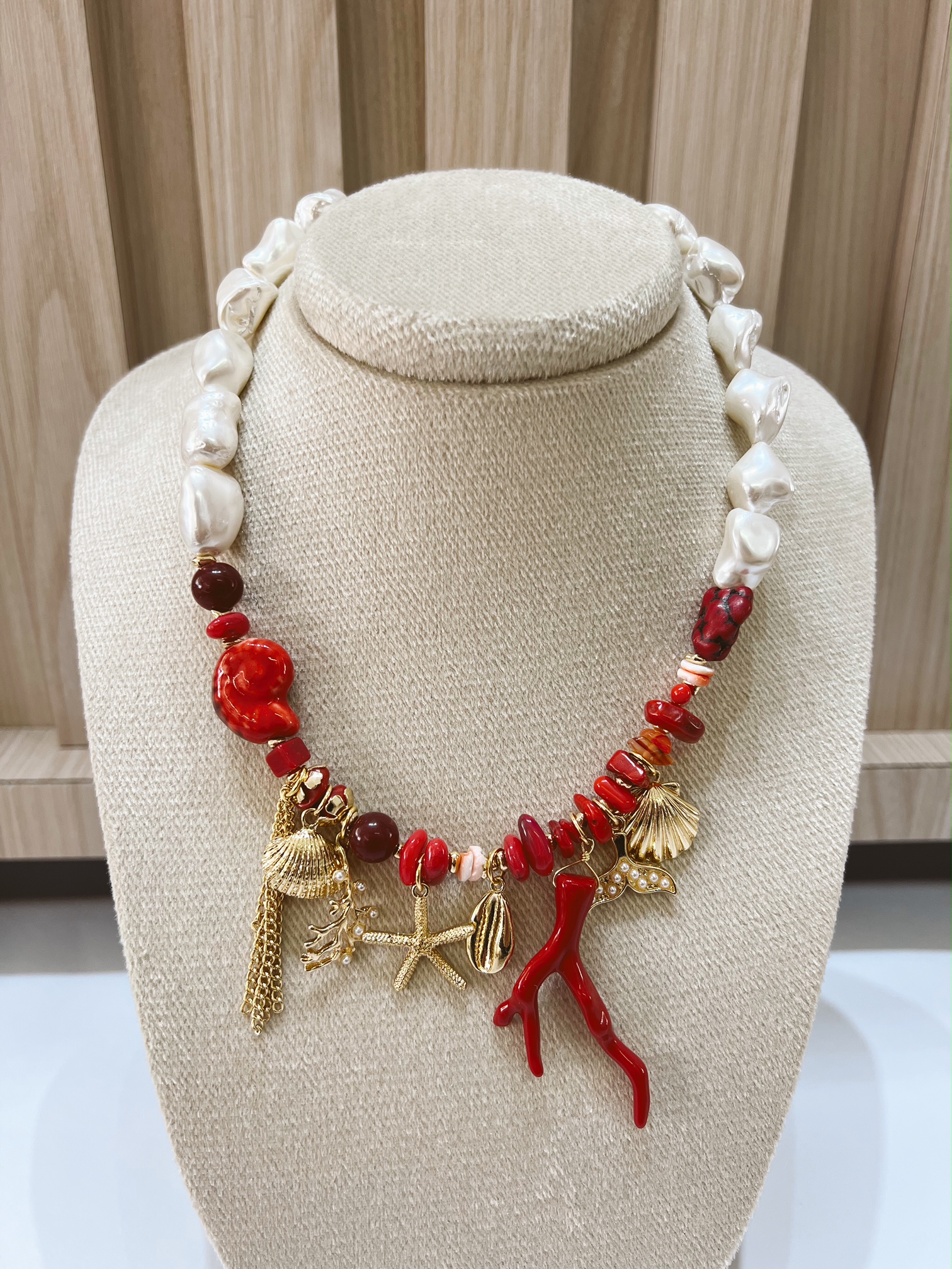 Collar perlas y charms rojos