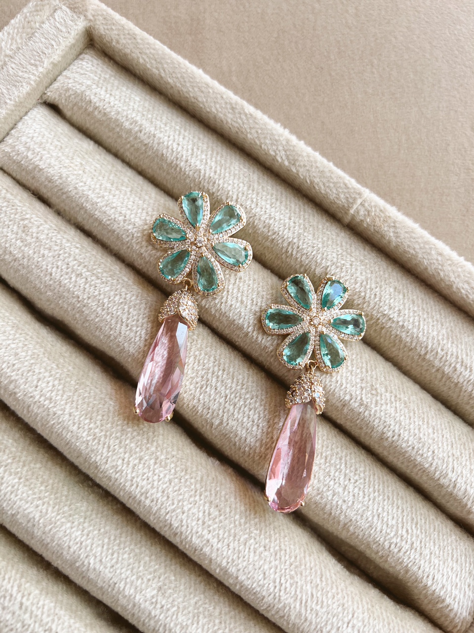 Zarcillo dorado flor azul piedra rosada