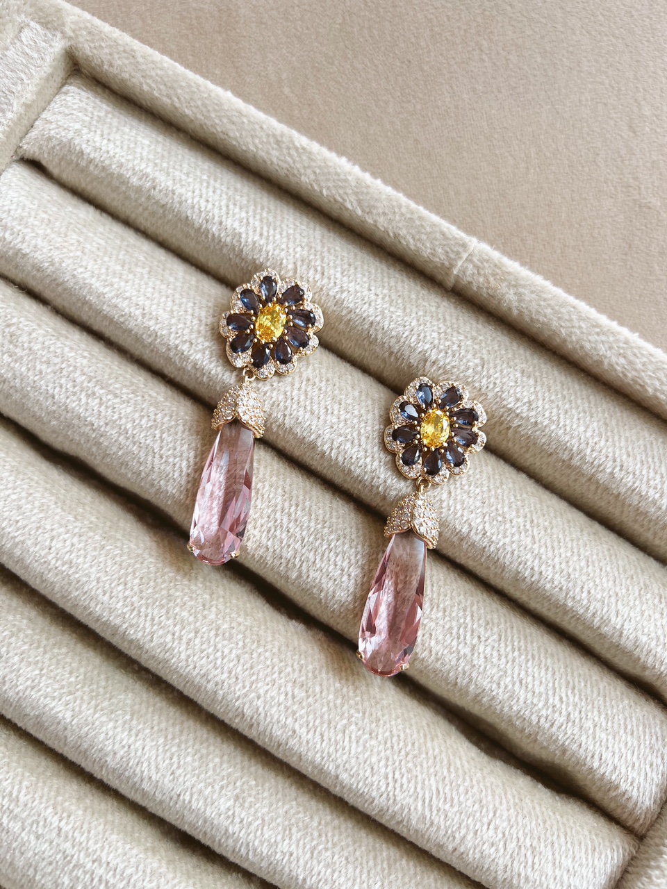 Zarcillo gold flor morada piedra rosada